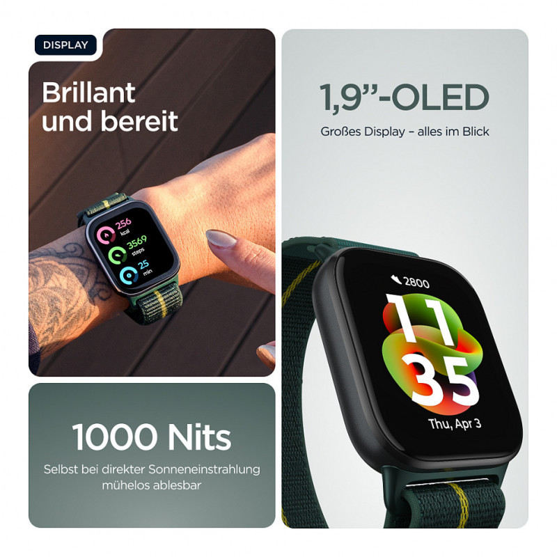 "Motorola moto watch fit. Display diagonal: 4.83 cm (1.9""), Display technology: OLED, Touchscreen. GPS (satellite). Weight: 25 g. Waterproof up to: 50 m, Band material: Fabric, Nylon, Band colour: Green, Yellow, Band size: One Size. Operating system installed: RTOS"\n"Fashionably fit