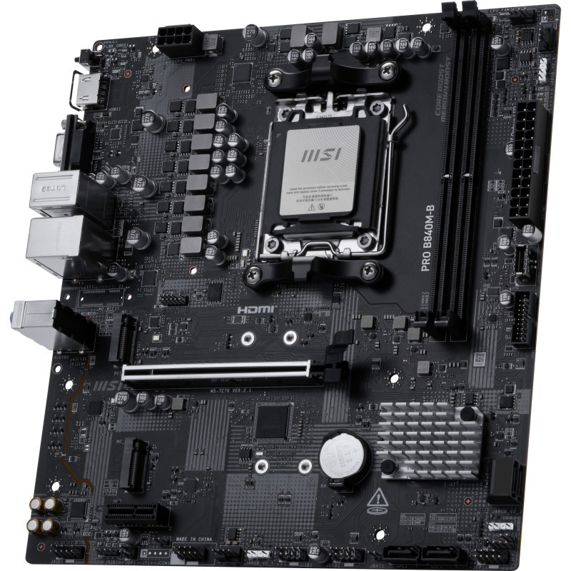 "MSI PRO B840M-B. Processor manufacturer: AMD, Processor socket: Socket AM5, Compatible processor series: AMD Ryzen 7000 Series, AMD Ryzen 8000 Series, AMD Ryzen 9000 Series. Supported memory types: DDR5-SDRAM, Maximum internal memory: 128 GB, Memory slots type: DIMM. Supported storage drive interfaces: M.2, Micro SATA III, Supported storage drive types: HDD & SSD, RAID levels: 0, 1, 10. Ethernet interface type: 2.5 Gigabit Ethernet, LAN controller: Realtek RTL8125D. Component for: PC, Motherboard form factor: micro ATX, Motherboard chipset family: AMD"\n"BUSINESS ELEGANCE