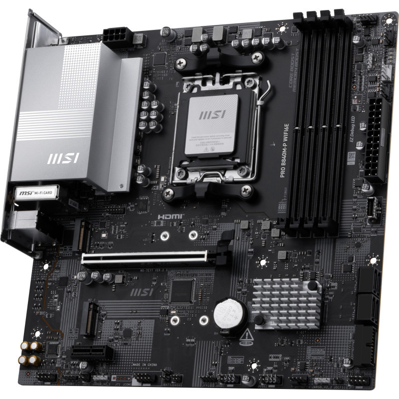 "MSI PRO B840M-P WIFI6E. Processor manufacturer: AMD, Processor socket: Socket AM5, Compatible processor series: AMD Ryzen 7000 Series, AMD Ryzen 8000 Series, AMD Ryzen 9000 Series. Supported memory types: DDR5-SDRAM, Maximum internal memory: 256 GB, Memory slots type: DIMM. Supported storage drive interfaces: M.2, Micro SATA III, Supported storage drive types: HDD & SSD, RAID levels: 0, 1, 10. Ethernet interface type: 2.5 Gigabit Ethernet, LAN controller: Realtek RTL8125D, Top Wi-Fi standard: Wi-Fi 6E (802.11ax). Component for: PC, Motherboard form factor: micro ATX, Motherboard chipset family: AMD"\n"PRO B840M-P WIFI6E