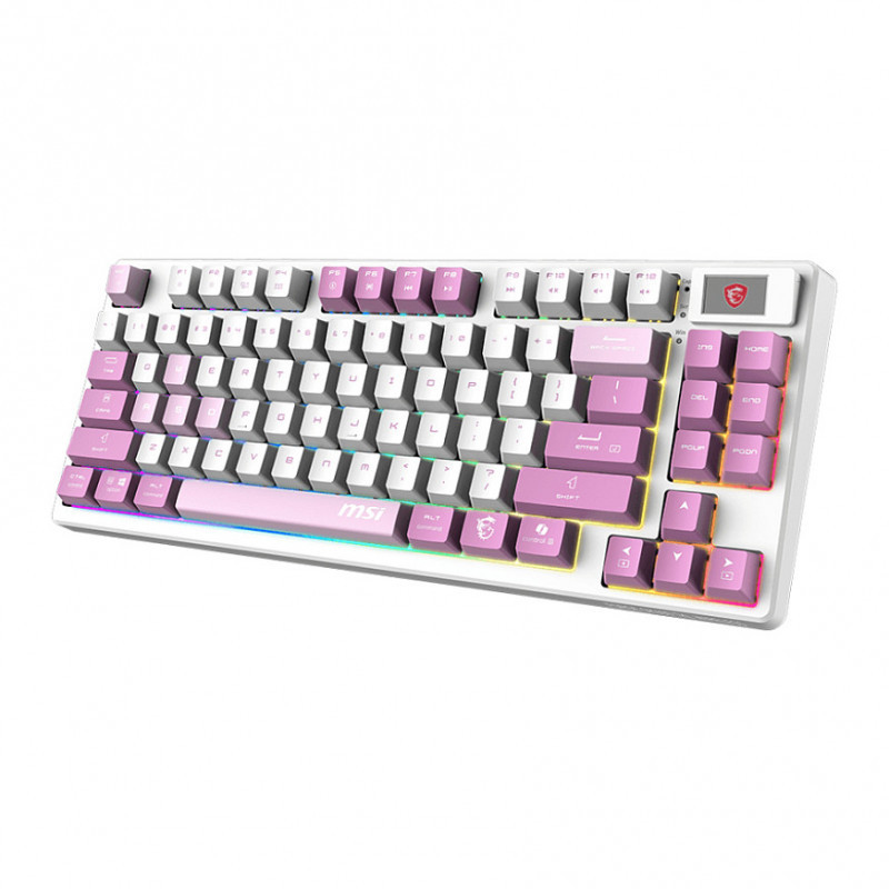 The MSI FORGE GK600 TKL WIRELESS VIOLET is a versatile tenkeyless keyboard with 2.4GHz wireless, Bluetooth, and wired modes. It features hot-swappable linear mechanical switches, durable PBT keycaps, sound-dampening gaskets, and a 1.06-inch display. With RGB lighting and a 4000mAh battery, it's ideal for gamers and creators.