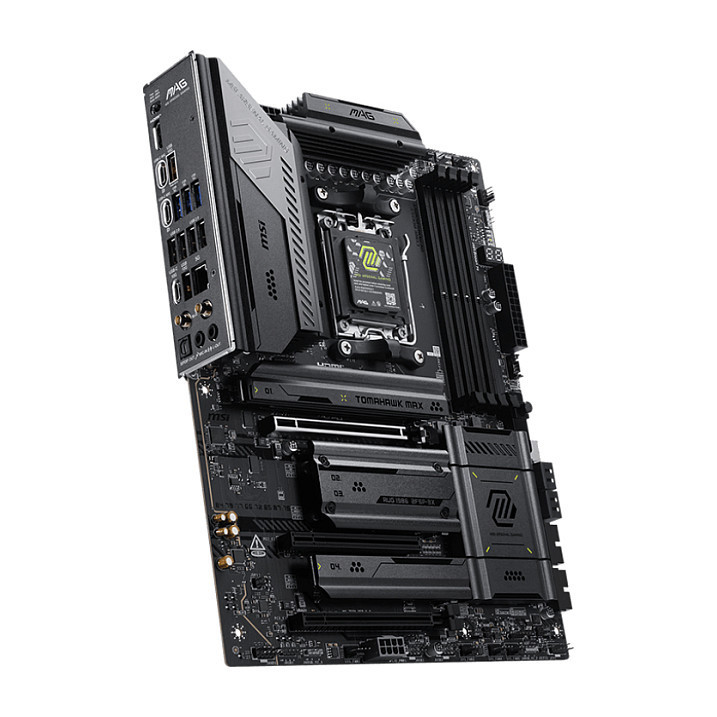 "MSI MAG X870E TOMAHAWK MAX WIFI. Processor manufacturer: AMD, Processor socket: Socket AM5, Compatible processor series: AMD Ryzen 7000 Series, AMD Ryzen 8000 Series, AMD Ryzen 9000 Series. Supported memory types: DDR5-SDRAM, Maximum internal memory: 256 GB, Memory slots type: DIMM. Supported storage drive interfaces: M.2, SATA III, Supported storage drive types: HDD & SSD, RAID levels: 0, 1, 10. Ethernet interface type: 5 Gigabit Ethernet, LAN controller: Realtek RTL8126, Top Wi-Fi standard: Wi-Fi 7 (802.11be). Component for: PC, Motherboard form factor: ATX, Motherboard chipset family: AMD"\n"MAG X870E TOMAHAWK MAX WIFI is designed for gamers with a stable, durable and DIY friendly foundation for their PC builds. Coming up with full-speed Wi-Fi 7 solution, 5G LAN, USB 40Gbps, PCIe 5.0 solutions, Supplemental PCIe Power, and exclusive EZ DIY features, it's ready for the battlefield of AMD Ryzen™ 9000 series processors.