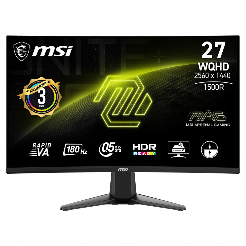 "MSI MAG 27CQ6F. Display diagonal: 68.6 cm (27""), Display resolution: 2560 x 1440 pixels, HD type: Quad HD, Display technology: LCD, Response time: 0.5 ms, Native aspect ratio: 16:9, Viewing angle, horizontal: 178°, Viewing angle, vertical: 178°. VESA mounting. Product colour: Black"\n"Visualize your victory with MSI MAG 27CQ6F gaming monitor. Equipped with a 180Hz Refresh rate, 0.5ms (GtG, Min.)response time panel, MAG 27CQ6F will give you the competitive edge you need to take down your opponents. The WQHD (2560x1440) high resolution will let you experience the mesmerizing images. Enjoy extremely smooth, tear-free gameplay with built-in Adaptive-Sync technology when paired with your GPU for ultra-smooth gameplay.