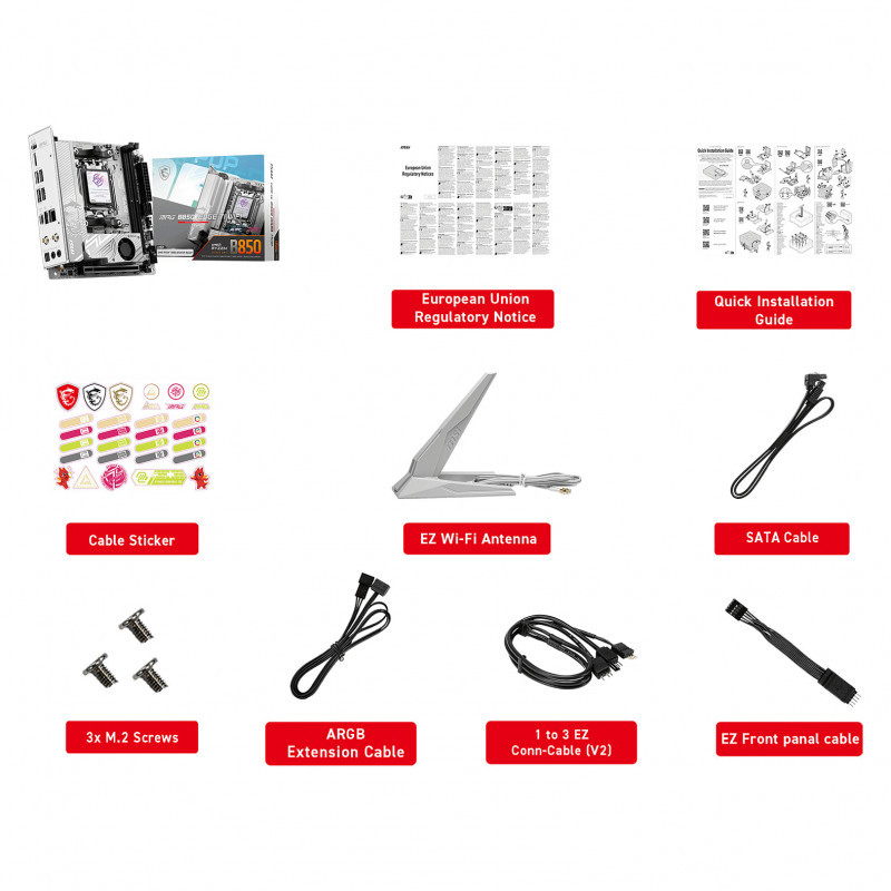 "MSI B850I EDGE TI WIFI. Processor manufacturer: AMD, Processor socket: Socket AM5, Compatible processor series: AMD Ryzen 7000 Series, AMD Ryzen 8000 Series, AMD Ryzen 9000 Series. Supported memory types: DDR5-SDRAM, Maximum internal memory: 128 GB, Memory slots type: DIMM. Supported storage drive interfaces: M.2, NVMe, SATA III, RAID levels: 0, 1. USB connector type: USB Type-A, USB Type-C. Ethernet interface type: 5 Gigabit Ethernet, LAN controller: Realtek RTL8126, Top Wi-Fi standard: Wi-Fi 7 (802.11be)"\n"Lightning Gen 5