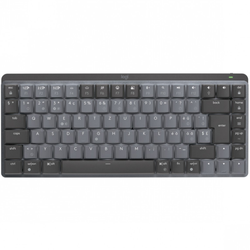 "Logitech Master MX Mechanical Mini. Keyboard form factor: Tenkeyless (80 - 87%). Keyboard style: Straight. Connectivity technology: Wireless, Device interface: RF Wireless + Bluetooth, Keyboard key switch: Mechanical, Keyboard layout: QWERTZ. Backlight type: LED. Cable length: 1 m. Recommended usage: Office. Product colour: Graphite"\n
