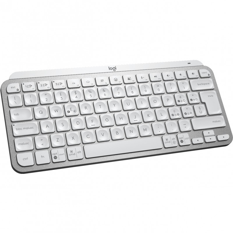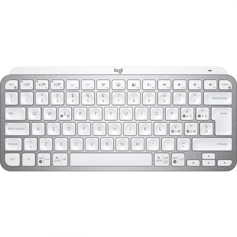 "Logitech MX Keys Mini Minimalist Wireless Illuminated Keyboard. Keyboard form factor: Mini. Keyboard style: Straight. Connectivity technology: Wireless, Device interface: RF Wireless + Bluetooth, Keyboard layout: QWERTY. Backlight type: LED. Recommended usage: Office. Product colour: Grey"\n