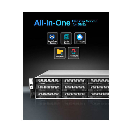 "TerraMaster U12-500 Plus. Type: NAS. Chassis type: Rack (2U). Device class: Home & Home Office. Processor family: Intel® Core™ i7. Internal memory: 16 GB, Internal memory type: DDR5. Total installed storage capacity: 0 TB"\n"High-Performance Backup Server: The U12-500 Plus NAS storage is powered by Core i7-1255U processor with 10 cores, 12 threads, and turbo speeds up to 4.7GHz. It features Iris Xe Graphics with a 1.25GHz dynamic frequency and supports AES NI hardware encryption. Equipped with 16GB DDR5 memory and dual 10 Gigabit Ethernet ports, it delivers strong performance. Its two M.2 NVMe slots enhance storage efficiency with Hyper Cache. This makes the U12-500 Plus a top choice for high-performance backup solutions for small to medium-sized businesses.
