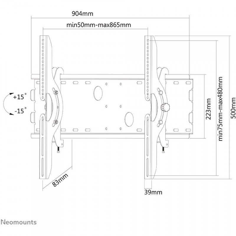 "Neomounts PLASMA-W200BLACK TV mount wall 37-85"" - tiltable. Maximum weight capacity: 100 kg, Minimum screen size: 94 cm (37""), Maximum screen size: 2.16 m (85""), Minimum VESA mount: 200 x 200 mm, Maximum VESA mount: 865 x 480 mm. Tilt angle range: 0 - 30°, Distance to the wall (max): 8.3 cm. Product colour: Black"\n"The Neomounts wall mount, model PLASMA-W200BLACK is a tiltable wall mount for flat screens up to 85"" (216 cm). This mount is a great choice when you want the ultimate viewing flexibility with your flat screen. Depth of this mount is 8,3 centimetres.