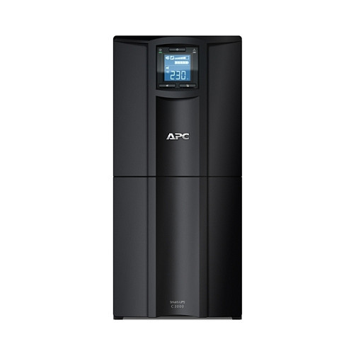 "APC Smart-UPS C, Line Interactive, 3kVA, Tower, 230V, 8x IEC C13+1x IEC C19 outlets, USB and Serial communication, AVR, Graphic LCD. UPS topology: Line-Interactive, Output power capacity: 3 kVA, Output power: 2100 W. AC outlet types: IEC 320. Battery life (max): 5 year(s), Battery recharge time: 3 h. Form factor: Tower, Product colour: Black. Width: 197 mm, Depth: 544 mm, Height: 435 mm"\n"This APC Smart-UPS is designed for small to medium business users to maintain business uptime and continuity. This 3kVA line interactive tower UPS provides pure sine wave power to support critical electronics during power disruptions. The UPS comes with IEC 320 C20 input, 8x IEC 320 C13 and 1x IEC 320 C19 outlets. The Smart-UPS C has an intuitive graphic LCD interface. This UPS has built-in lead-acid battery and is covered by a 2-year UPS warranty. This line interactive UPS operates in green mode for high operating efficiency. The SMC has built-in lead-acid battery and is covered by a 2-year UPS warranty. This UPS provides surge protection against lightning strikes, power sags, brownouts and surges. This is compatible with a dedicated user-replaceable battery, and the APC replacement battery cartridge helps restore UPS performance to the original specifications."