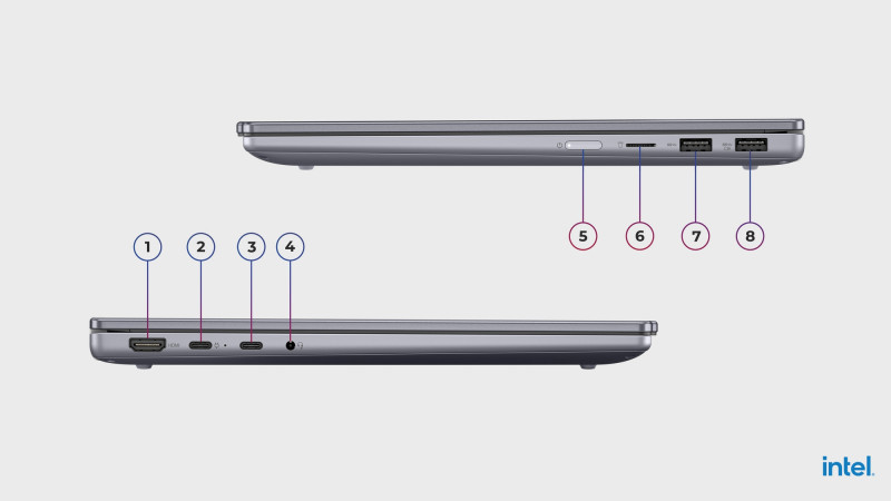 1x USB-A (USB 5Gbps/USB 3.2 Gen 1); 1x USB-A (USB 5Gbps/USB 3.2 Gen 1), Always On; 2x USB-C (USB 10Gbps/USB 3.2 Gen 2), with USB PD 3.1 and DisplayPort 1.4; 1x Headphone/microphone combo jack (3.5mm); 1x microSD card reader |