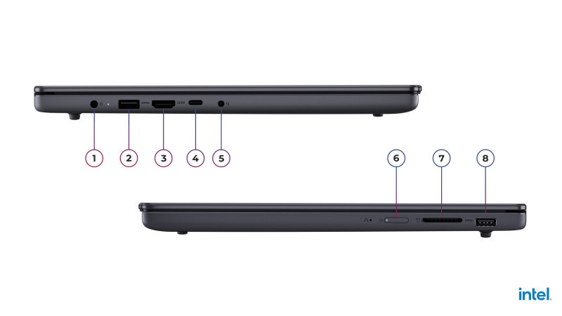 2x USB-A (USB 5Gbps/USB 3.2 Gen 1); 1x USB-C (USB 5Gbps/USB 3.2 Gen 1), with USB PD 3.0 and DisplayPort 1.2; 1x Headphone/microphone combo jack (3.5mm); 1x SD card reader; 1x Power connector |