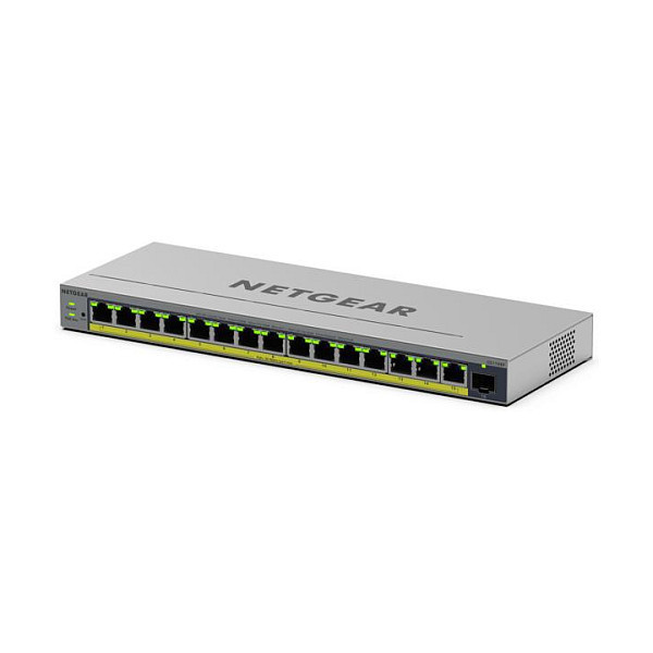 "NETGEAR GS116EP. Switch type: Managed, Switch layer: L2/L3. Basic switching RJ-45 Ethernet ports type: Gigabit Ethernet (10/100/1000), Basic switching RJ-45 Ethernet ports quantity: 16, Installed SFP modules quantity: 1. MAC address table: 8000 entries, Switching capacity: 1 Gbit/s. Networking standards: IEEE 802.1p, IEEE 802.3az. Power over Ethernet (PoE)"\n"GIGABIT ETHERNET AND FIBER