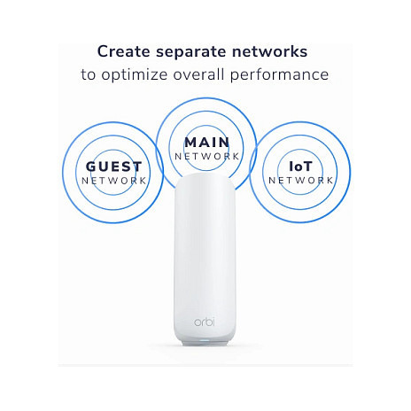 "NETGEAR Orbi 370. Product colour: White, Antenna type: Internal, Product type: Mesh satellite. Wi-Fi band: Dual-band (2.4 GHz / 5 GHz), Top Wi-Fi standard: Wi-Fi 7 (802.11be), WLAN data transfer rate (max): 3500 Mbit/s. Processor frequency: 1.5 GHz. Ethernet LAN data rates: 10,100,1000,2500 Mbit/s. Width: 120 mm, Depth: 75 mm, Height: 203.7 mm"\n"Expanding your Orbi™ system is as easy as the push of a button. Easily add 1,500 sq. ft. of additional WiFi 7 coverage to your existing Orbi 370 Series mesh system.