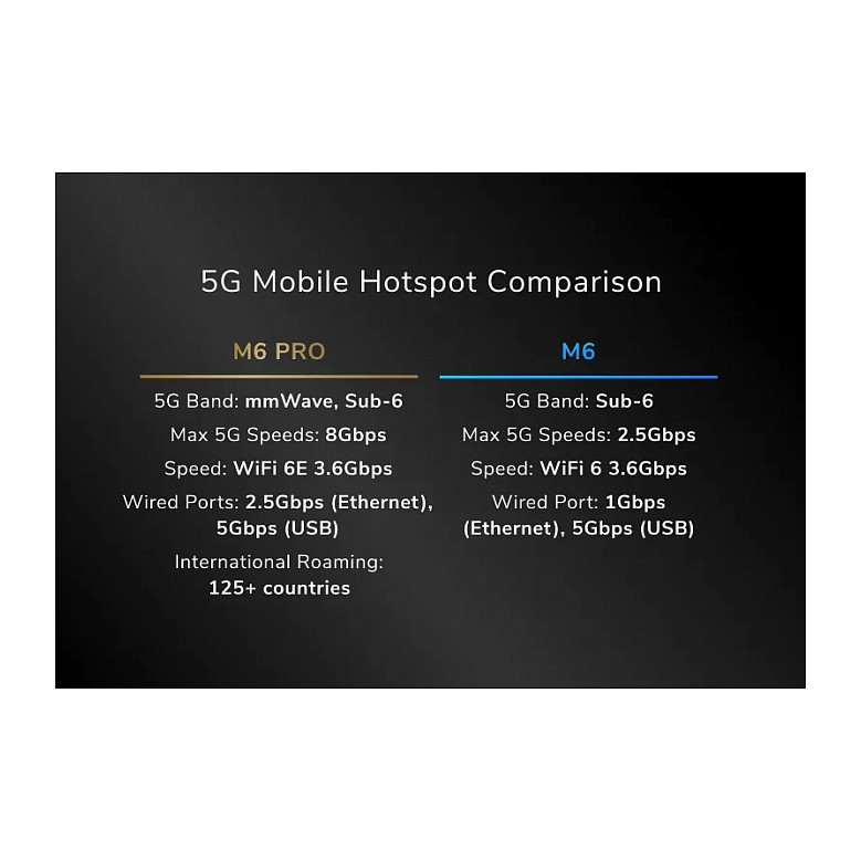 "NETGEAR Nighthawk M6. Device type: Cellular network router, Product colour: Black, Market positioning: Portable. Ethernet LAN interface type: Gigabit Ethernet, Ethernet LAN data rates: 10,100,1000 Mbit/s, Supported network protocols: IPv6. Wi-Fi standards: 802.11a, 802.11b, 802.11g, Wi-Fi 4 (802.11n), Wi-Fi 5 (802.11ac), Wi-Fi 6 (802.11ax), Wi-Fi frequency: 5 GHz. Data network: 4G, 5G, LTE, 4G standard: LTE. USB port type: USB Type-C"\n"Unlocked for ultimate flexibility