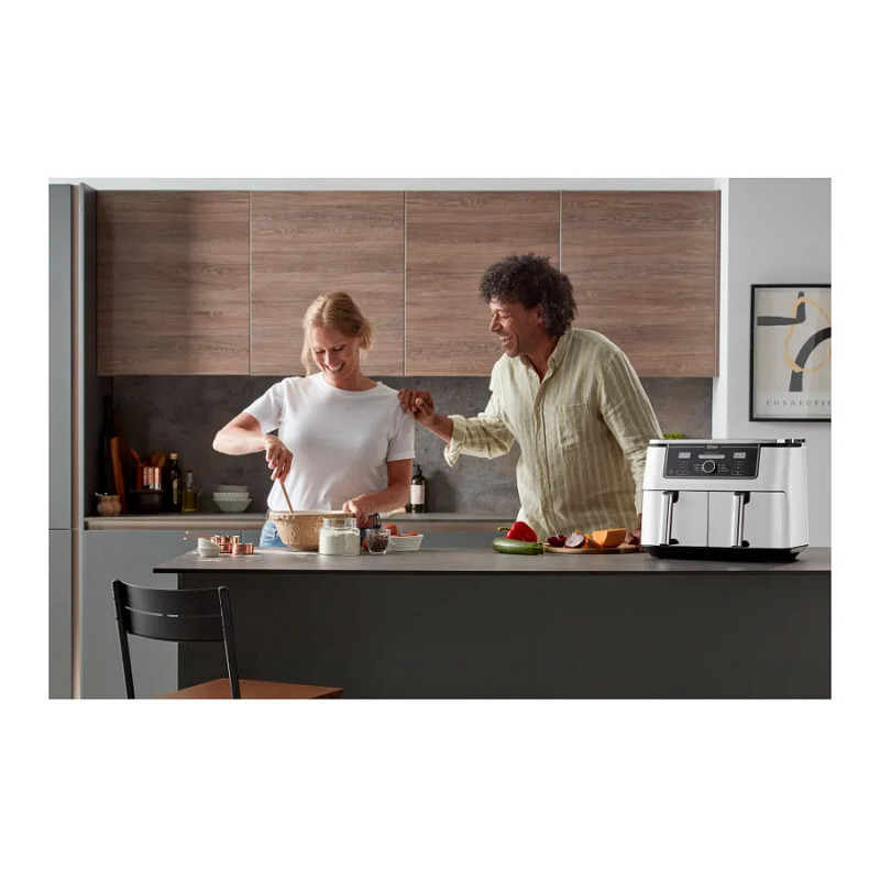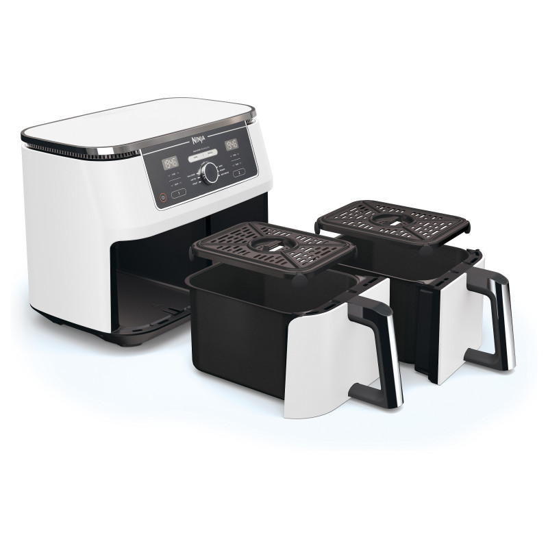 "Ninja AF400EU. Product type: Hot air fryer, Capacity: 9.5 L. Construction type: Double, Product colour: White, Control type: Rotary, Touch. Power: 2470 W, AC input voltage: 220 - 240 V, AC input frequency: 50 - 60 Hz. Width: 415 mm, Depth: 270 mm, Height: 325 mm. Package width: 500 mm, Package depth: 410 mm, Package height: 388 mm"\n
