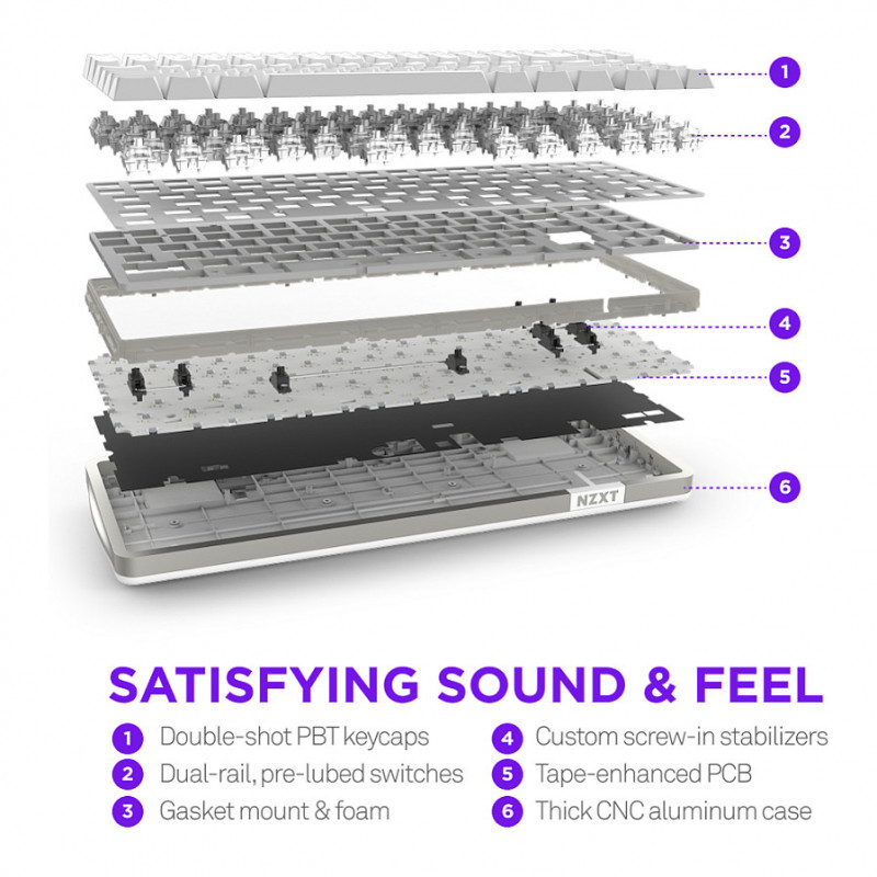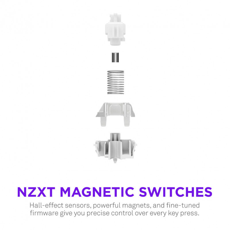 - NZXT Magnetic Switches: Hall effect sensors, powerful magnets, and fine-tuned firmware precisely track every keystroke, unlocking advanced ways to customize how you game and type.