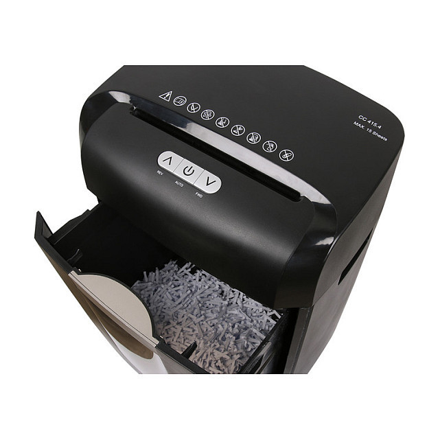 "Olympia CC 415.4. Shredding type: Cross shredding, Working width: 22 cm, Shredding size: 4 x 35 mm. Power consumption (typical): 320 W, AC input voltage: 230 V, AC input frequency: 50 Hz. Width: 348 mm, Depth: 250 mm, Height: 502 mm"\n"Professional Shredder CC 415.4"