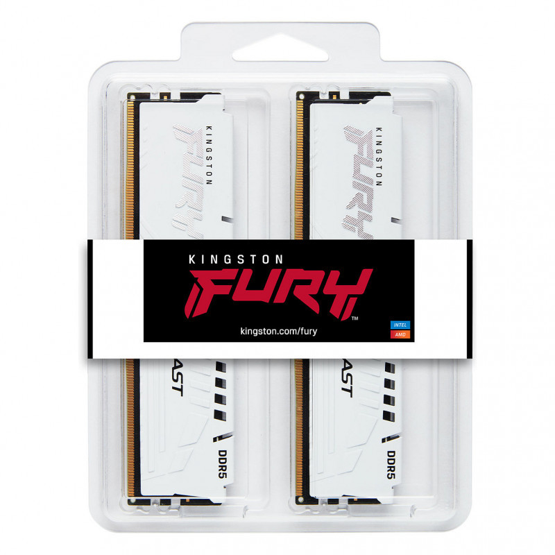 "Kingston Technology FURY Beast 32GB 6000MT/s DDR5 CL36 DIMM (Kit of 2) White EXPO. Component for: PC, Internal memory: 32 GB, Memory layout (modules x size): 2 x 16 GB, Internal memory type: DDR5, Memory form factor: 288-pin DIMM, CAS latency: 36, Product colour: White"\n"Up to 6800MT/s