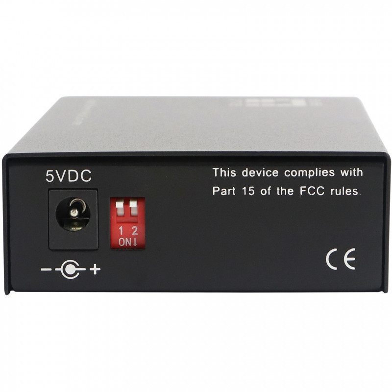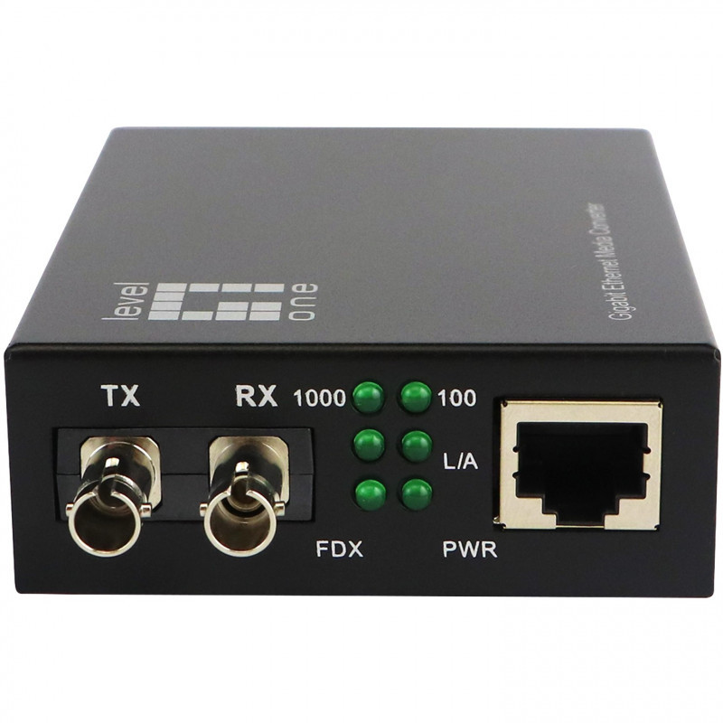 "LevelOne RJ45 to ST Gigabit Media Converter, Single-Mode Fiber, 1310nm, 20km. Maximum data transfer rate: 1000 Mbit/s, Converter input interface: 1000Base-LX, 1000Base-SX, Networking standards: IEEE 802.3, IEEE 802.3ab, IEEE 802.3u, IEEE 802.3z. Maximum transfer distance: 20000 m, Wavelength: 1310 nm, Fiber mode structure: Single-mode. LED indicators: Link, Power, Product colour: Black. Fiber optic connector: ST, Connectivity technology: Wired. Power consumption (typical): 5 W"\n"The GVT-2003 SMF ST media converter is able to convert network signals between copper and fiber-optic based networks. The converter provides a 10/100/1000Base-T RJ-45 port, supports full duplex and half duplex switch connectivity and 10Base-T, 100Base-TX and 1000Base-T auto-sensing. Used in single-mode with fibre-optic cabling, this can extend a network range up to 20km. The device features built-in Dip switches for easy converter configuration, which function on the Smart LFP (Link Fault Pass-through), allowing the converter to monitor both the fiber and copper ports for signal loss, as well as cut through and smart pass through mode. The GVT-2003 is able to operate in temperatures from -10° up to 55° Celsius. The converter can be used as a standalone unit or as a slide-in module to the CHV-2000 19” converter rack, which can accommodate up to 14 units for use in a central wiring closet."