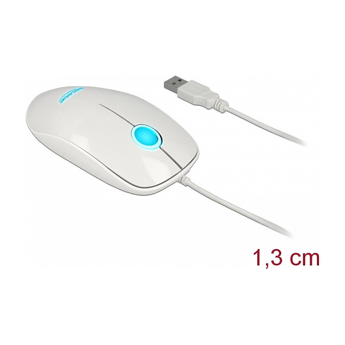 "DeLOCK 12537. Form factor: Ambidextrous. Movement detection technology: Optical, Device interface: USB Type-A, Movement resolution: 1200 DPI, Buttons type: Pressed buttons, Buttons quantity: 3, Scroll type: Wheel. Product colour: White"\n"This wired USB desktop mouse by Delock can be connected to a computer with USB Type-A port. Optically it convinces with its glossy housing and illuminated elements."