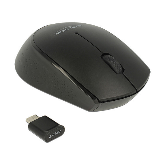 "DeLOCK 12526. Form factor: Ambidextrous. Movement detection technology: Optical, Device interface: RF Wireless, Movement resolution: 1000 DPI, Buttons type: Pressed buttons, Buttons quantity: 2, Scroll type: Wheel. Power source: Batteries. Product colour: Black"\n"This wireless mouse by Delock is connected to the computer via the compact USB Type-C receiver. During transport it can be placed inside a compartment at the bottom of the mouse. The 2.4 GHz wireless technology provides a maximum operating range of up to 10 meters. The small size makes the mouse a perfect companion during travel."