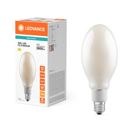 "Osram HQL LED FILAMENT VALUE. Bulb power: 24 W, Equivalent bulb power: 80 W, Fitting/cap type: E27, Luminous flux: 3600 lm, Bulb lifetime: 25000 h, Light colour: Warm white, Colour temperature: 2700 K, Beam angle (max): 360°, Color Rendering Index (CRI): 80, Power factor: 0.9"\n