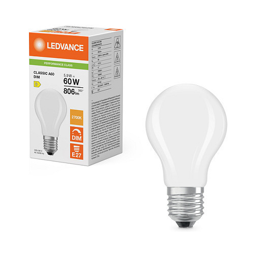 "Osram LED CLASSIC A DIM P. Bulb power: 5.9 W, Equivalent bulb power: 60 W, Fitting/cap type: E27, Luminous flux: 806 lm, Bulb lifetime: 15000 h, Light colour: Warm white, Colour temperature: 2700 K, Beam angle (max): 300°, Color Rendering Index (CRI): 80, Power factor: 0.65"\n