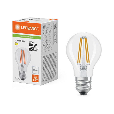 "Osram LED Classic A P. Bulb power: 5.9 W, Equivalent bulb power: 60 W, Fitting/cap type: E27, Luminous flux: 806 lm, Bulb lifetime: 15000 h, Light colour: Cool white, Colour temperature: 4000 K, Beam angle (max): 300°, Color Rendering Index (CRI): 80, Power factor: 0.65"\n