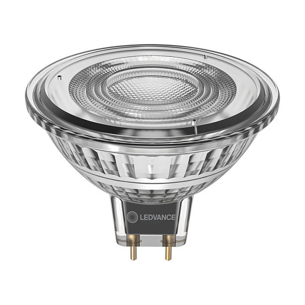 "LEDVANCE 4099854456152. Bulb power: 4.9 W, Equivalent bulb power: 43 W, Fitting/cap type: GU5.3, Luminous flux: 500 lm, Bulb lifetime: 40000 h, Light colour: Warm white, Colour temperature: 2700 K, Beam angle (max): 36°, Color Rendering Index (CRI): 97, Power factor: 0.5"\n