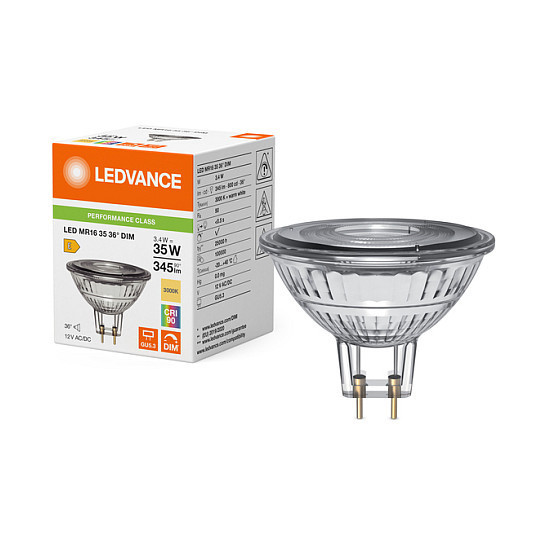 "Osram LED MR16 DIM P. Bulb power: 3.4 W, Equivalent bulb power: 35 W, Fitting/cap type: GU5.3, Luminous flux: 345 lm, Bulb lifetime: 25000 h, Light colour: Warm white, Colour temperature: 3000 K, Beam angle (max): 36°, Color Rendering Index (CRI): 90, Power factor: 0.5"\n