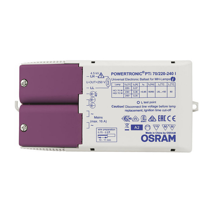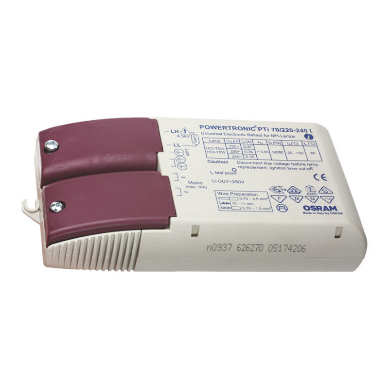 "Osram PTi 70/220…240 I. Lifetime: 50000 h, Operating temperature (T-T): -25 - 50 °C. AC input voltage: 198 - 264 V, Input frequency: 50/60 Hz, Input current: 45 A. Width: 83 mm, Depth: 171 mm, Height: 32 mm"\n