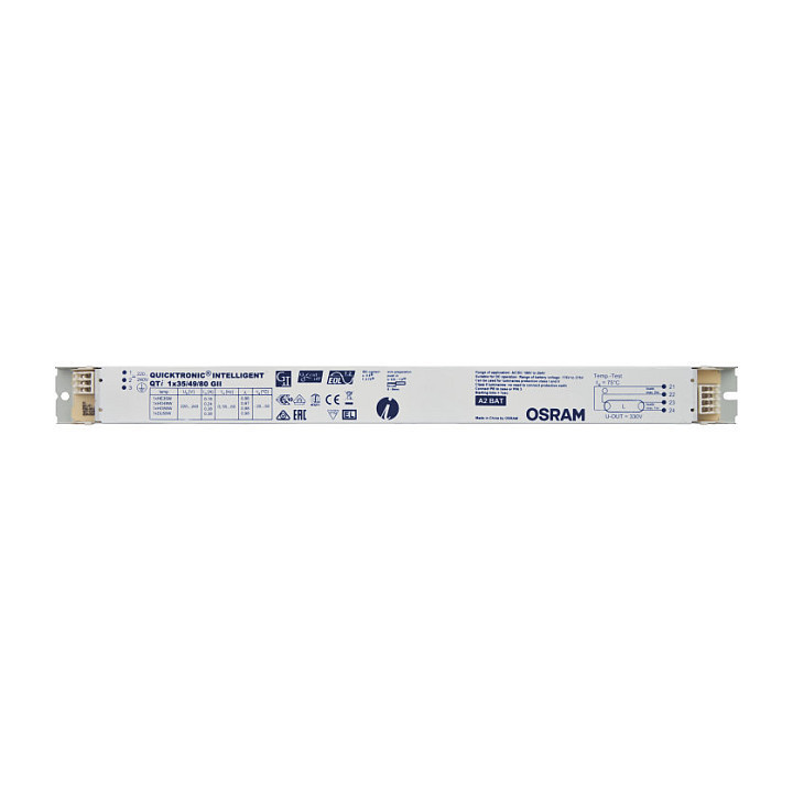 "Osram QTi 1X35/49/80 GII. Lifetime: 100000 h, Operating temperature (T-T): -20 - 50 °C. AC input voltage: 198 - 264 V, Input frequency: 50/60 Hz, Input current: 53 A. Width: 30 mm, Depth: 360 mm, Height: 21 mm"\n