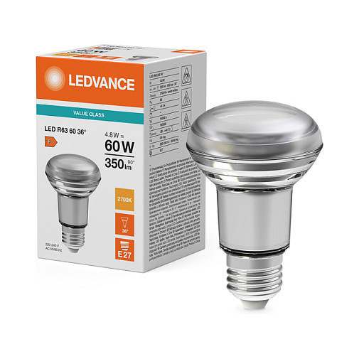 "Osram LED R63 P. Bulb power: 4.8 W, Equivalent bulb power: 60 W, Fitting/cap type: E27, Luminous flux: 670 lm, Bulb lifetime: 15000 h, Light colour: Warm white, Colour temperature: 2700 K, Beam angle (max): 36°, Color Rendering Index (CRI): 80, Power factor: 0.5"\n