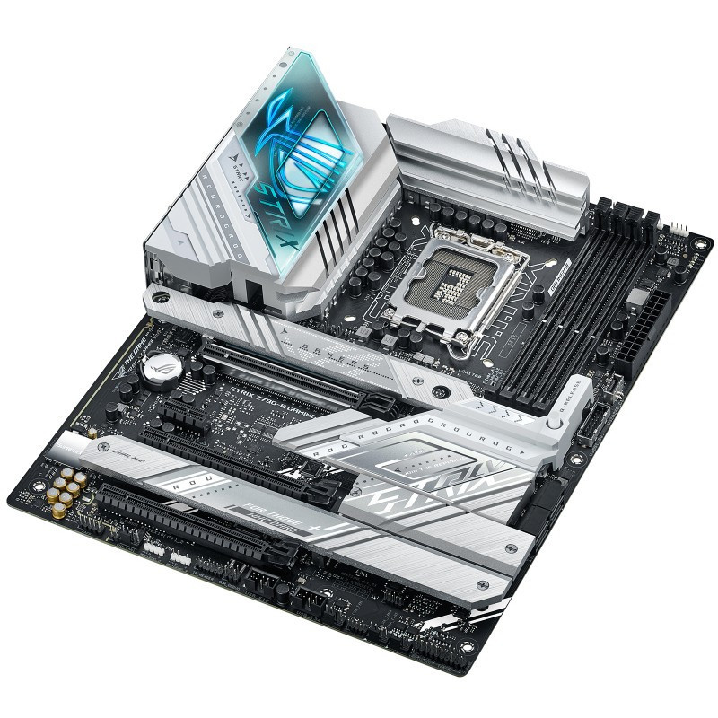 The ROG Strix Z790-A boldly embraces the light, for an alternate take on build themes to its dark and brooding brother, the Strix Z790-F. Silver metallic heatsinks pop against a dark PCB backdrop and call attention to the board's high capacity for thermal management. A transparent layer on the I/O shield adds a unique touch and emphasizes the customizable RGB logo below. The whole design is tied together with ROG-centric detailing on the board, heatsinks, and I/O shield for a vibrant and futuristic outlook. Pair the Strix Z790-A with other products from the diverse ROG ecosystem to create a fully-customized gaming setup that reflects your personal style.