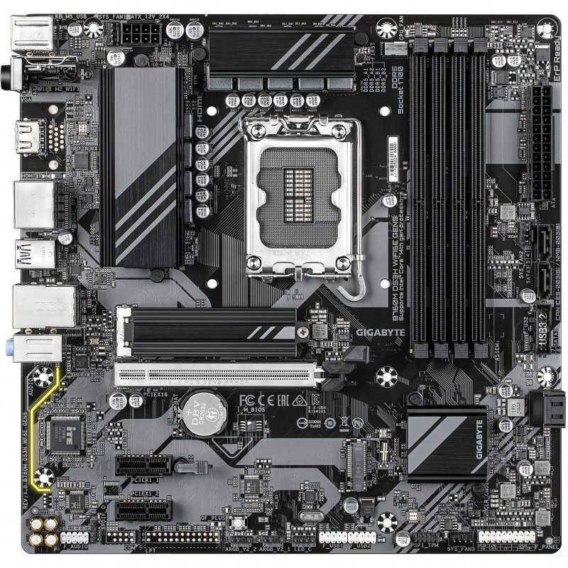 "GIGABYTE B760M DS3H WIFI6E GEN5 Motherboard - Supports Intel Core 14th Gen CPUs, 6+2+1 Phases Digital VRM, up to 5600MHz DDR5, 2xPCIe 4.0 M.2, Wi-Fi 6E, 2.5GbE LAN, USB 3.2 Gen2. Processor manufacturer: Intel, Processor socket: LGA 1700, Compatible processor series: Intel® Celeron®, Intel Core i3 12th Gen, Intel Core i3 13th Gen, Intel Core i3 14th Gen, Intel.... Supported memory types: DDR5-SDRAM, Maximum internal memory: 256 GB, Memory slots type: DIMM. Supported storage drive interfaces: M.2, PCI Express 4.0, SATA III, Supported storage drive types: HDD & SSD, RAID levels: 0, 1, 5, 10. Maximum resolution: 4096 x 2304 pixels. Ethernet interface type: 2.5 Gigabit Ethernet, LAN controller: Realtek RTL8125, Top Wi-Fi standard: Wi-Fi 6E (802.11ax)"\n"Elevate your computing experience with GIGABYTE's renowned motherboard series: AORUS, AERO, and GIGABYTE. Featuring innovative designs and advanced features, these boards offer exceptional performance and reliability. Whether you're a gamer, content creator, or professional, our series cater to your needs, ensuring uncompromising quality and cutting-edge technology."