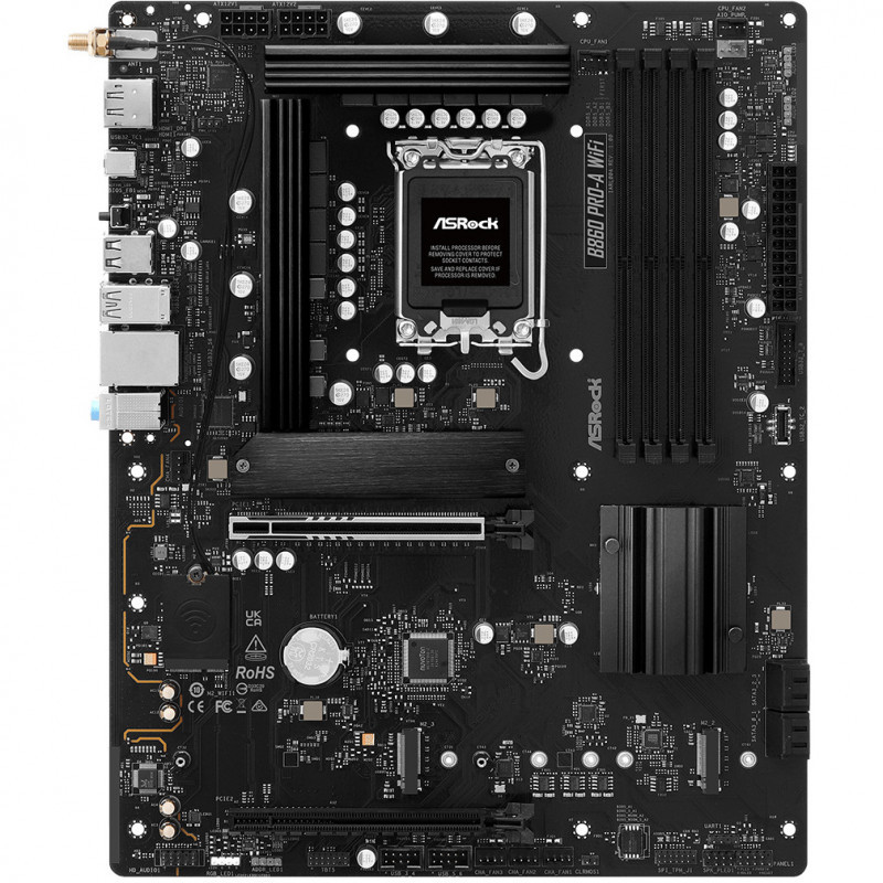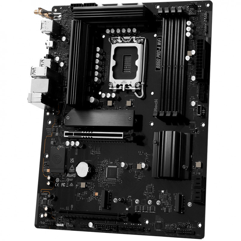 "Asrock B860 Pro-A WiFi. Processor manufacturer: Intel, Processor socket: LGA 1851 (Socket V1). Supported memory types: DDR5-SDRAM, Maximum internal memory: 256 GB, Memory slots type: DIMM. Supported storage drive interfaces: M.2, SATA III, RAID levels: 0, 1, 5, 10. Graphics card family: Intel. Ethernet interface type: 2.5 Gigabit Ethernet, LAN controller: Dragon RTL8125BG, Top Wi-Fi standard: Wi-Fi 6E (802.11ax)"\n"Pro-A series is designed for enhanced stability, durability, and efficiency, it offers reliable performance, user-friendly features and a streamlined aesthetic, making it ideal for daily computing needs.