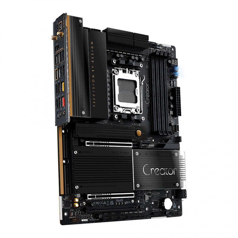 "Asrock X870 Taichi Creator. Processor manufacturer: AMD, Processor socket: Socket AM5, Compatible processor series: AMD Ryzen 7000 Series, AMD Ryzen 8000 Series, AMD Ryzen 9000 Series. Supported memory types: DDR5-SDRAM, Maximum internal memory: 256 GB, Memory slots type: DIMM. Supported storage drive interfaces: M.2, SATA III, Supported storage drive types: HDD & SSD, RAID levels: 0, 1, 10. Ethernet interface type: 10 Gigabit Ethernet, LAN controller: Marvell AQC113, Top Wi-Fi standard: Wi-Fi 7 (802.11be). Component for: PC, Motherboard form factor: ATX, Motherboard chipset family: AMD"\n"Built for professional creators, Taichi Creator motherboards deliver precise performance, stable power, and advanced connectivity—empowering your workflow with reliability and style.