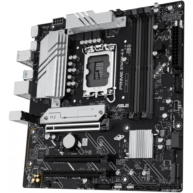 "ASUS PRIME B760M-A II-CSM. Processor manufacturer: Intel, Processor socket: LGA 1700, Compatible processor series: Intel® Celeron®, Intel® Pentium® Gold, Intel® Core™ i3, Intel® Core™ i5, Intel® Core™.... Supported memory types: DDR5-SDRAM, Maximum internal memory: 256 GB, Memory slots type: DIMM. Supported storage drive interfaces: M.2, PCI Express 4.0, SATA III, Supported storage drive types: HDD & SSD, RAID levels: 0, 1, 5, 10. Maximum resolution: 3840 x 2160 pixels. Ethernet interface type: 2.5 Gigabit Ethernet"\n"ASUS Prime series motherboards are expertly engineered to unleash the full potential of 14th Gen Intel® Core™ Processors. Boasting a robust power design, comprehensive cooling solutions and intelligent tuning options, PRIME B760M-A II-CSM provides users and PC DIY builders with a range of performance optimizations via intuitive software and firmware features. This platform delivers the power and connectivity that advanced AI PC applications demand.