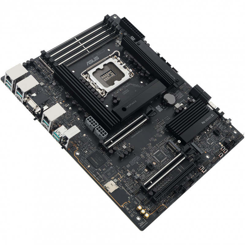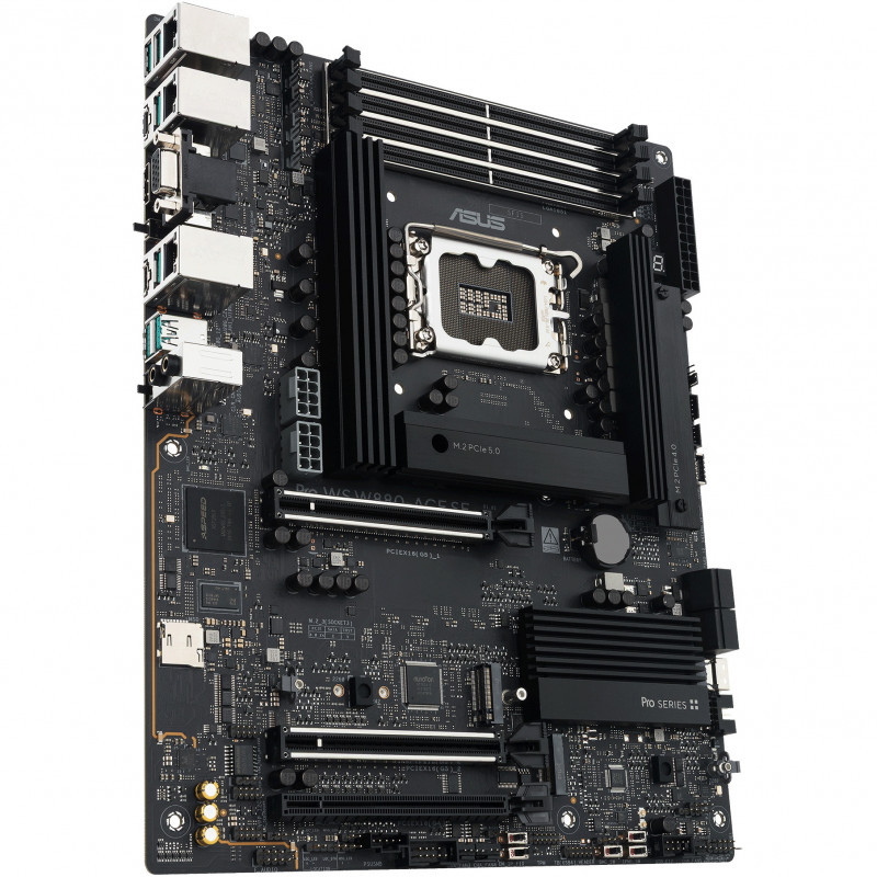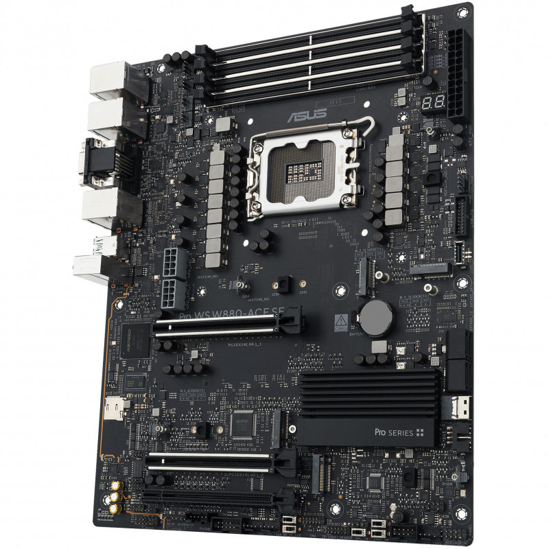 "ASUS PRO WS W880-ACE SE. Processor manufacturer: Intel, Processor socket: LGA 1851 (Socket V1), Compatible processor series: Intel Core Ultra (Series 2). Supported memory types: DDR5-SDRAM, Maximum internal memory: 256 GB, Memory slots type: DIMM. Supported storage drive interfaces: M.2, PCI Express 4.0, PCI Express 5.0, SATA III, Supported storage drive types: HDD & SSD, RAID levels: 0, 1, 5, 10. Maximum resolution: 3840 x 2160 pixels. Ethernet interface type: 2.5 Gigabit Ethernet, Gigabit Ethernet"\n"The Pro WS W880-ACE SE empowers workstation users of all levels by maximizing the performance of the latest Intel® Core™ Ultra Processor (Series 2) processors with 8+1+2+2 team power stages, DDR5 slots, PCIe® 5.0 and lightning-fast connectivity including Thunderbolt™ 4 port, dual 2.5Gb Ethernet.