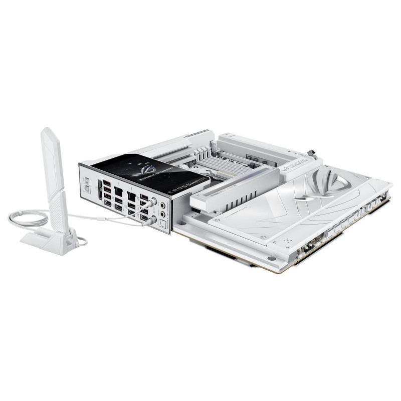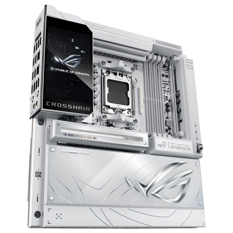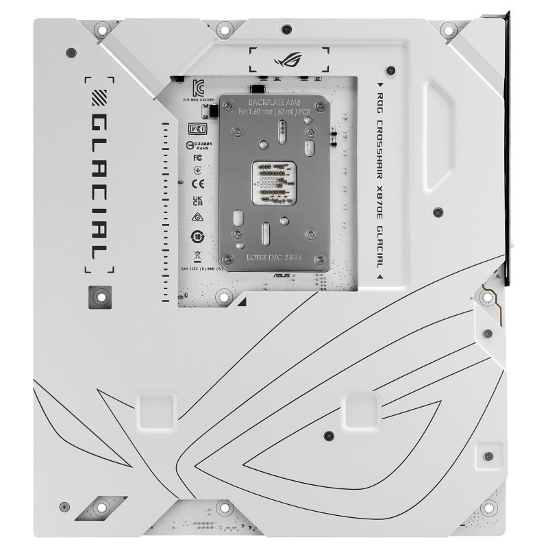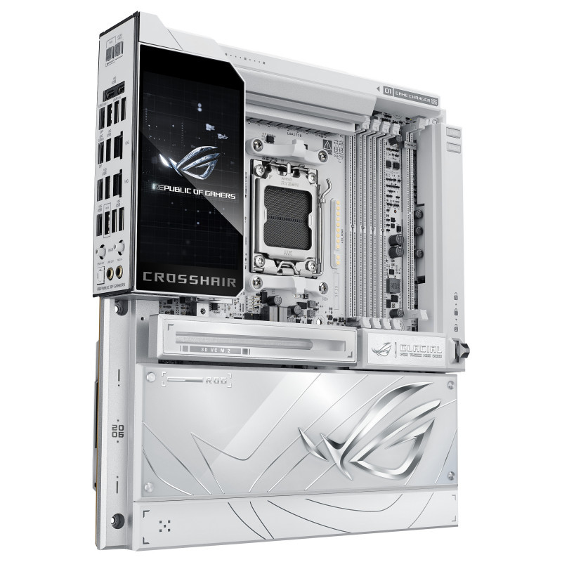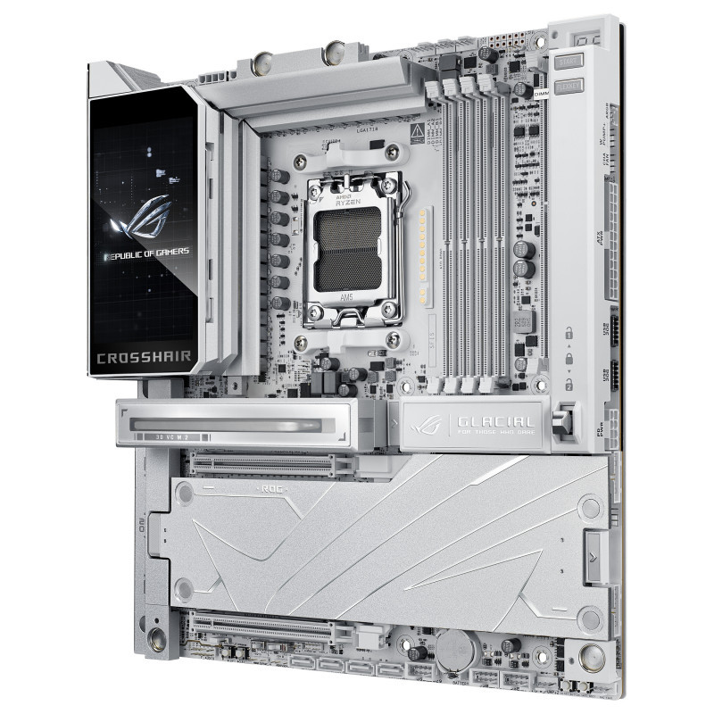 "ASUS ROG CROSSHAIR X870E GLACIAL. Processor manufacturer: AMD, Processor socket: Socket AM5, Compatible processor series: AMD Ryzen 7000 Series, AMD Ryzen 8000 Series, AMD Ryzen 9000 Series. Supported memory types: DDR5-SDRAM, Maximum internal memory: 256 GB, Memory slots type: DIMM. Supported storage drive interfaces: M.2, SATA III, Supported storage drive types: HDD & SSD, RAID levels: 0, 1, 5, 10. Ethernet interface type: 10 Gigabit Ethernet, Top Wi-Fi standard: Wi-Fi 7 (802.11be), Wi-Fi standards: Wi-Fi 7 (802.11be). Component for: PC, Motherboard form factor: Extended ATX, Motherboard chipset family: AMD"\n"The ROG X870E Glacial is a flagship motherboard engineered for uncompromising performance and sophisticated AI. It boasts a robust 24+2+2 power stage design, Dynamic OC Switcher, and Core Flex for next-generation overclocking control. Meanwhile, advanced memory tuning is unlocked through server-grade DRAM enhancement and NitroPath DRAM technology, and storage scales with support for up to seven M.2 drives. Top-tier connectivity includes two 10G Ethernet ports, two USB4® ports, and two USB 20Gbps Type-C® front-panel connectors. This motherboard also features a 3D VC M.2 heatsink and a 5-inch LCD display, along with AI Cache Boost and AI Advisor for smarter, more intuitive system tuning.