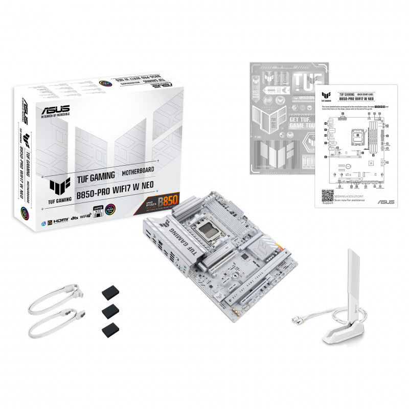 "ASUS TUF GAMING B850-PRO WIFI7 W NEO. Processor manufacturer: AMD, Processor socket: Socket AM5, Compatible processor series: AMD Ryzen 9000 Series, AMD Ryzen 8000 Series, AMD Ryzen 7000 Series. Supported memory types: DDR5-SDRAM, Maximum internal memory: 256 GB, Memory slots type: DIMM. Supported storage drive interfaces: M.2, SATA III, Supported storage drive types: HDD & SSD, RAID levels: 0, 1, 5, 10. Ethernet interface type: 2.5 Gigabit Ethernet, Top Wi-Fi standard: Wi-Fi 7 (802.11be), Wi-Fi standards: Wi-Fi 7 (802.11be). Component for: PC, Motherboard form factor: ATX, Motherboard chipset family: AMD"\n"TUF GAMING