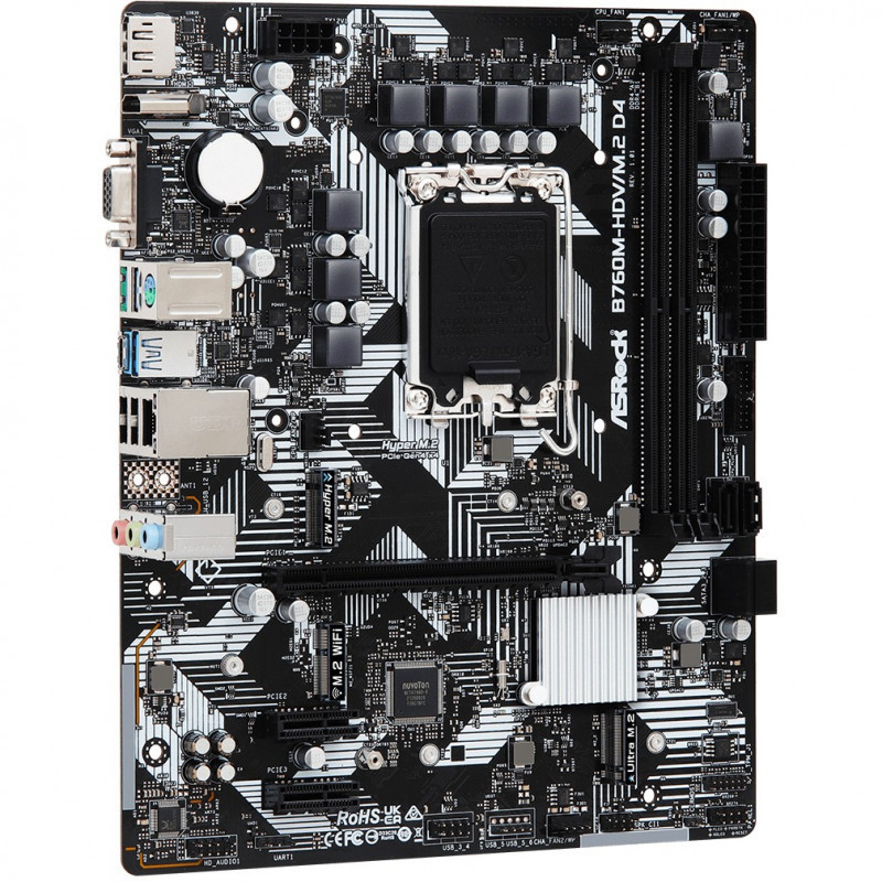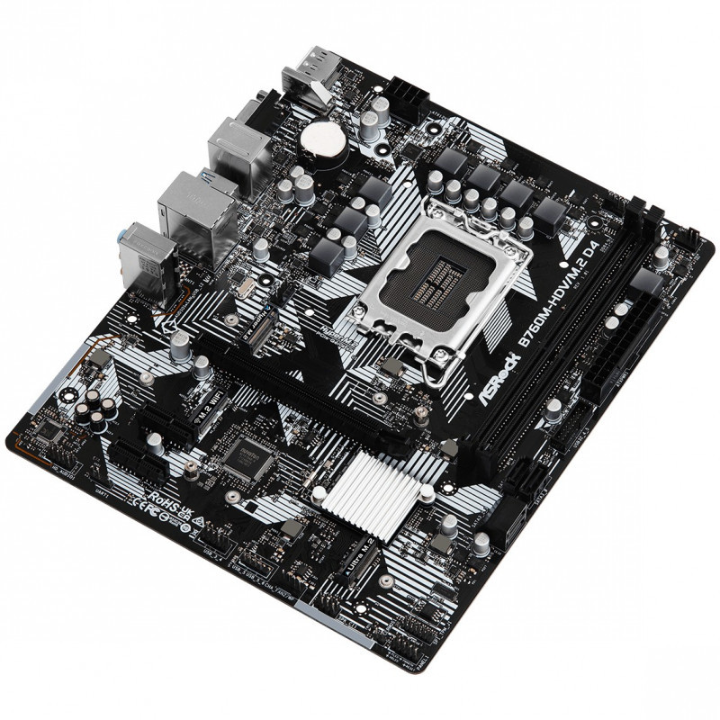 "Asrock B760M-HDV/M.2 D4. Processor manufacturer: Intel, Processor socket: LGA 1700, Compatible processor series: Intel® Core™ i3, Intel® Core™ i5, Intel® Core™ i7, Intel® Core™ i9. Supported memory types: DDR4-SDRAM, Maximum internal memory: 64 GB, Memory slots type: DIMM. Supported storage drive interfaces: M.2, SATA III, RAID levels: 0, 1, 5, 10. Ethernet interface type: Gigabit Ethernet, LAN controller: Realtek RTL8111H. Component for: PC, Motherboard form factor: micro ATX, Motherboard chipset family: Intel"\n"5+1+1 Power Phase Design