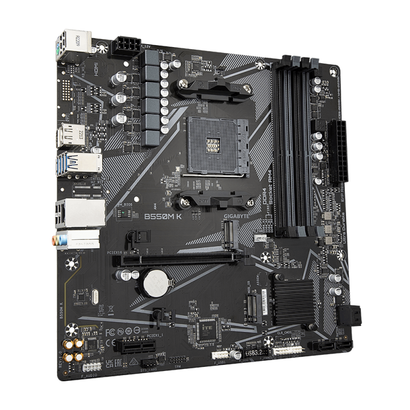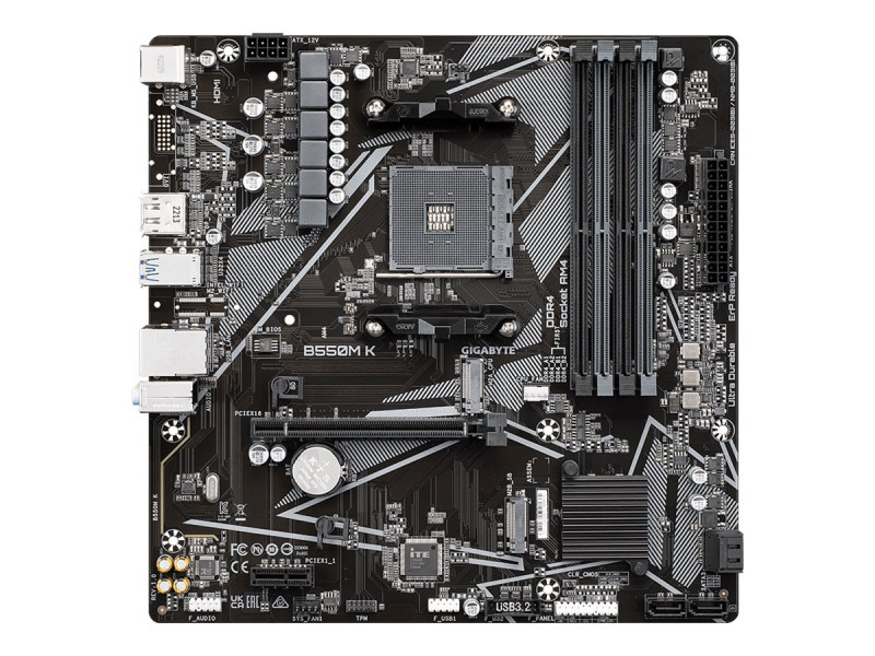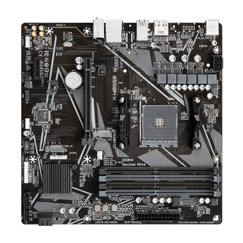 Gigabyte | B550M K 1.0 M/B | Processor family AMD | Processor socket AM4 | DDR4 DIMM | Memory slots 4 | Supported hard disk drive interfaces SATA, M.2 | Number of SATA connectors 4 | Chipset AMD B550 | Micro ATX