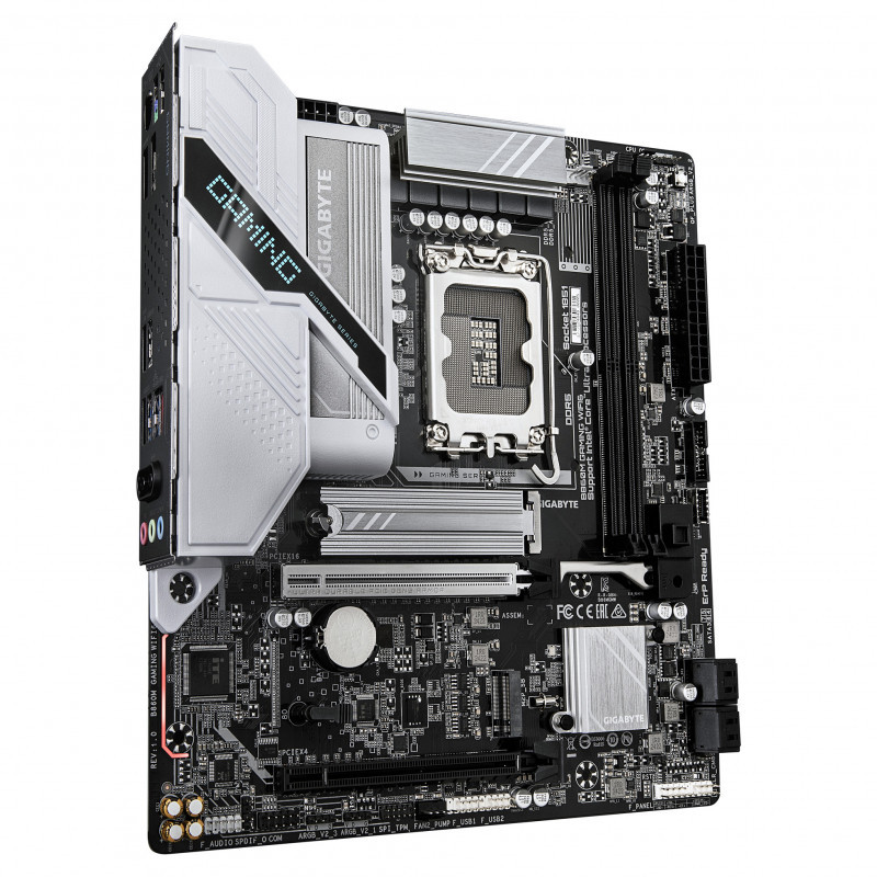 "GIGABYTE B860M GAMING WIFI6 Motherboard - Intel Core Ultra Series CPUs, 8+1+2 Phases VRM, up to 9066MHz DDR5, 1xPCIe 5.0 + 1xPCIe 4.0 M.2, 2.5GbE LAN, WIFI 6, USB 3.2 Gen 1. Processor manufacturer: Intel, Processor socket: LGA 1851 (Socket V1), Compatible processor series: Intel® Core™ Ultra (Series 1), Intel Core Ultra (Series 2). Supported memory types: DDR5-SDRAM, Maximum internal memory: 128 GB, Memory slots type: DIMM. Supported storage drive interfaces: M.2, SATA III, Supported storage drive types: HDD & SSD, RAID levels: 0, 1, 5, 10. Maximum resolution: 4096 x 2160 pixels. Ethernet interface type: 2.5 Gigabit Ethernet, Top Wi-Fi standard: Wi-Fi 6 (802.11ax), Wi-Fi standards: 802.11a, 802.11b, 802.11g, Wi-Fi 4 (802.11n), Wi-Fi 5 (802.11ac), Wi-Fi 6 (802.11ax)"\n"Elevate your computing experience with GIGABYTE's renowned motherboard series: AORUS, AERO, and GIGABYTE. Featuring innovative designs and advanced features, these boards offer exceptional performance and reliability. Whether you're a gamer, content creator, or professional, our series cater to your needs, ensuring uncompromising quality and cutting-edge technology.