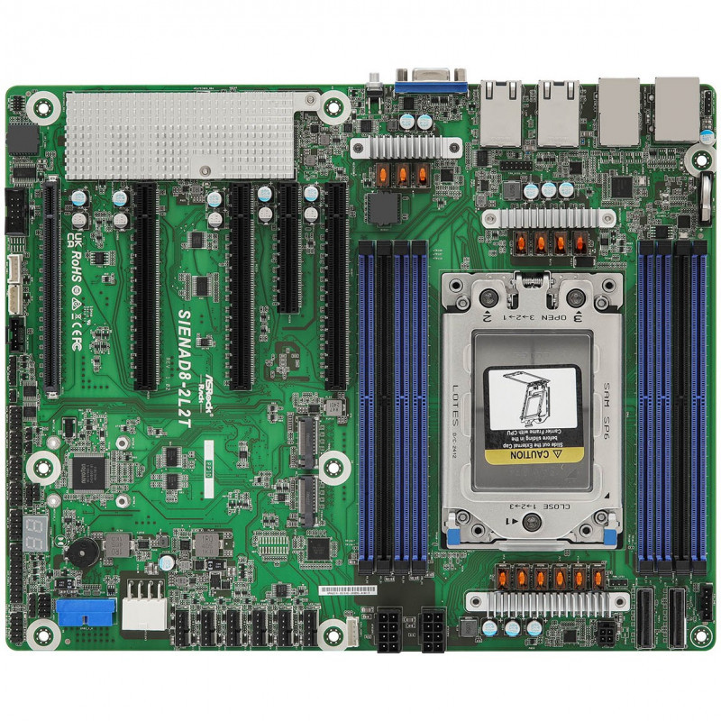 "Asrock SIENAD8-2L2T. Processor manufacturer: AMD, Processor socket: Socket SP6, Compatible processor series: AMD EPYC. Supported memory types: DDR5-SDRAM, Memory slots type: DIMM, Memory voltage: 1.1 V. Supported storage drive interfaces: M.2, PCI Express 5.0, Supported storage drive types: SSD. Graphics card family: ASPEED, Graphics card: AST2600. Ethernet interface type: 10 Gigabit Ethernet, Gigabit Ethernet, LAN controller: Intel I210, Intel X710-AT2"\n