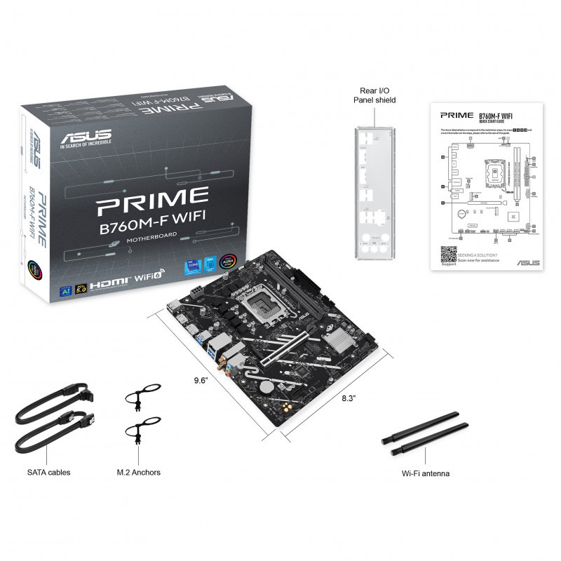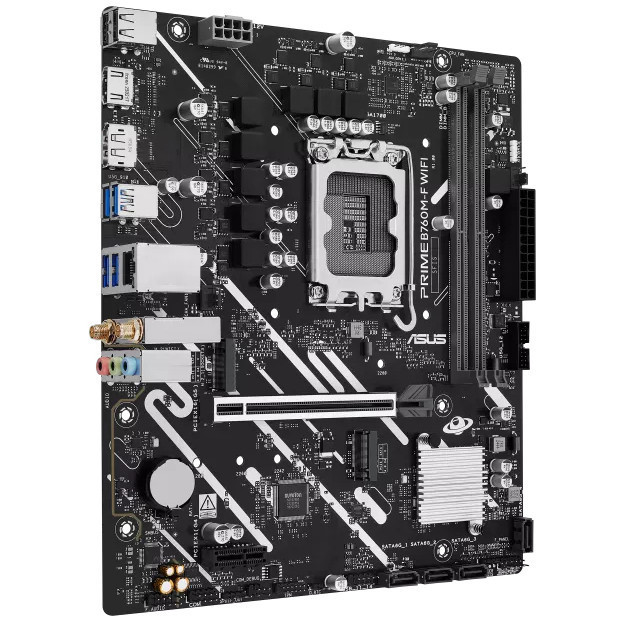 "ASUS PRIME B760M-F WIFI. Processor manufacturer: Intel, Processor socket: LGA 1700, Compatible processor series: Intel® Celeron®, Intel® Pentium® Gold, Intel® Core™ i3, Intel® Core™ i5, Intel® Core™.... Supported memory types: DDR5-SDRAM, Maximum internal memory: 96 GB, Memory slots type: DIMM. Supported storage drive interfaces: M.2, SATA III, Supported storage drive types: HDD & SSD, RAID levels: 0, 1, 5, 10. Ethernet interface type: 2.5 Gigabit Ethernet, Top Wi-Fi standard: Wi-Fi 6 (802.11ax). Component for: PC, Motherboard form factor: micro ATX, Motherboard chipset family: Intel"\n"ASUS Prime series motherboards are expertly engineered to unleash the full potential of 14th & 13th Gen Intel® Core™ Processors. Boasting a robust power design, comprehensive cooling solutions and intelligent tuning options, PRIME B760M-F WIFI provides users and PC DIY builders with a range of performance optimizations via intuitive software and firmware features. This platform delivers the power and connectivity that advanced AI PC applications demand.
