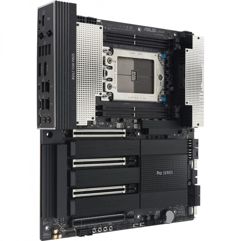 "ASUS PRO WS TRX50-SAGE WIFI A. Processor manufacturer: AMD, Processor socket: Socket sTR5, Compatible processor series: AMD Ryzen Threadripper 7000 Series, AMD Ryzen Threadripper PRO 7000 WX-Series. Supported memory types: DDR5-SDRAM, Memory slots type: DIMM, Memory channels: Dual-channel. Supported storage drive interfaces: M.2, SATA III, SlimSAS, Supported storage drive types: HDD & SSD, RAID levels: 0, 1, 5, 10. Ethernet interface type: 2.5 Gigabit Ethernet, 10 Gigabit Ethernet, LAN controller: Intel I226-LM, Top Wi-Fi standard: Wi-Fi 7 (802.11be). Component for: Workstation, Motherboard form factor: CEB, Motherboard chipset family: AMD"\n"A WORKSTATION WONDERLAND