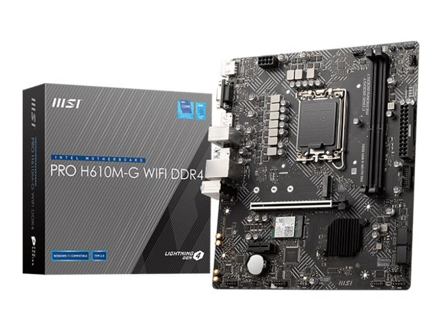 MSI PRO H610M-G WIFI DDR4 | Processor family Intel | Processor socket LGA1700 | DDR4 | Supported hard disk drive interfaces SATA, M.2 | Number of SATA connectors 4