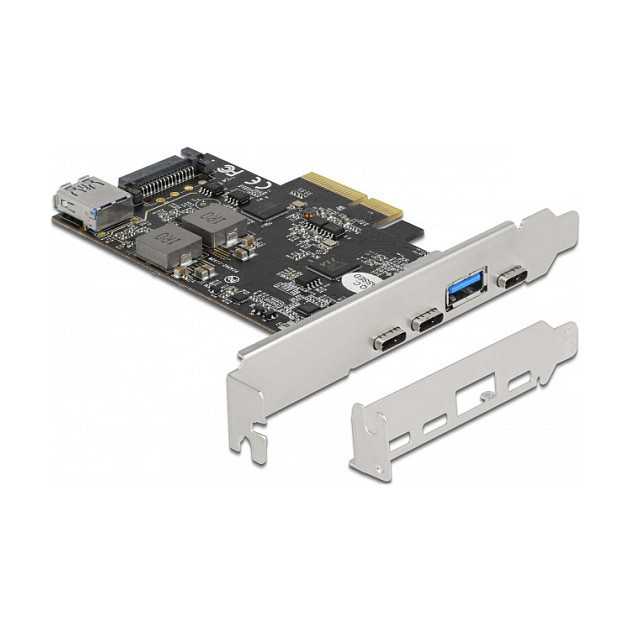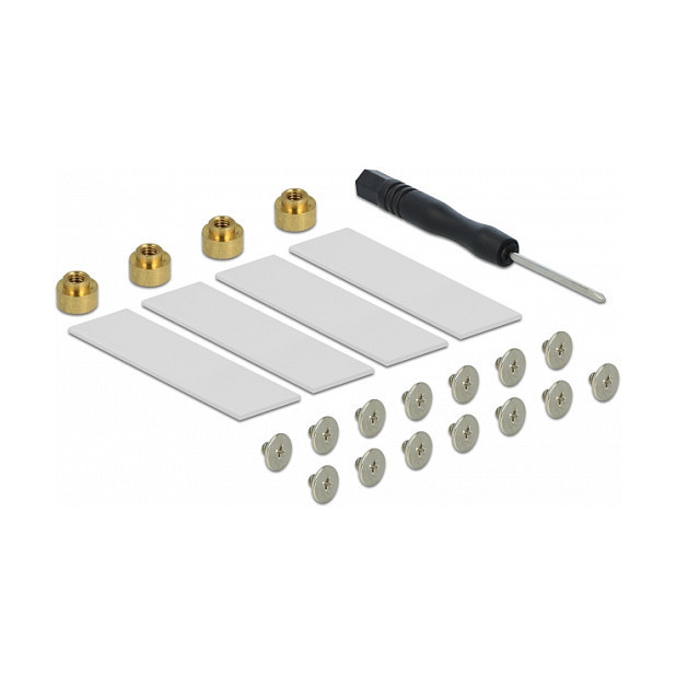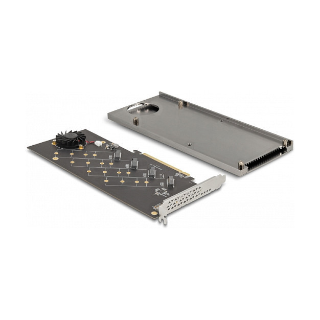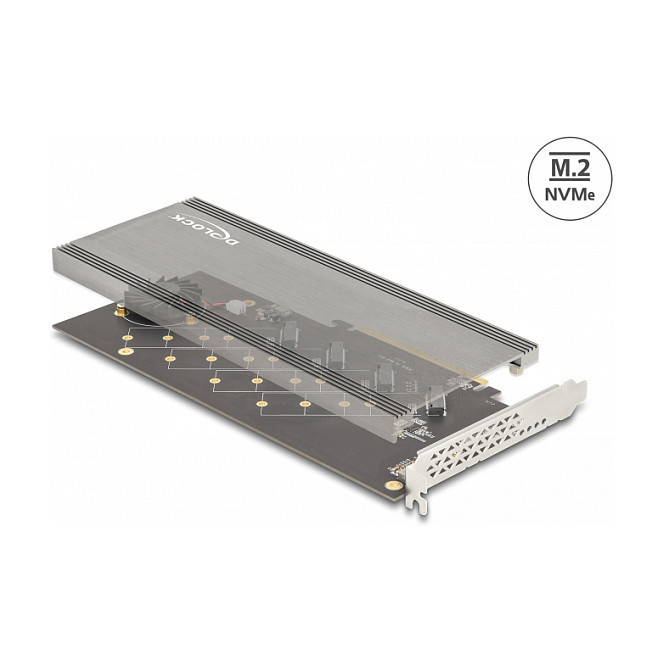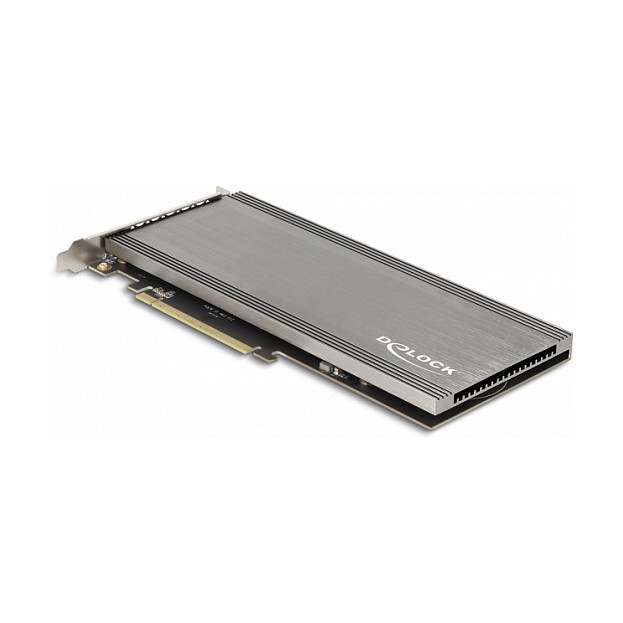 "DeLOCK PCI Express 4.0 x16 Card to 4 x internal NVMe M.2 Key M with Heat Sink and Fan - Bifurcation. Host interface: PCIe, Output interface: M.2, Expansion card standard: PCIe 4.0. Product colour: Grey, Number of fans: 1 fan(s), Country of origin: China. Windows operating systems supported: Windows 10, Windows 10 x64, Windows 11, Windows 8.1, Windows 8.1 x64, Linux operating systems supported: Linux Kernel 5.8, Server operating systems supported: Windows Server 2019. Width: 95 mm, Depth: 238 mm, Height: 8 mm. Quantity per pack: 1 pc(s), Package type: Box"\n"This PCI Express card by Delock expands the PC by four M.2 slots. Up to four M.2 SSDs in format 2280, 2260, 2242 and 2230 can be connected. With the help of the large heat sink and the fan, sufficient cooling of the M.2 modules is guaranteed.