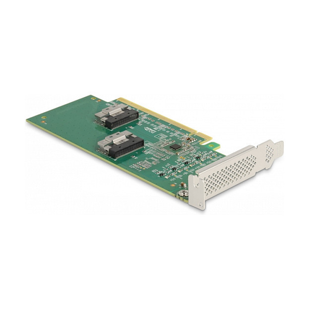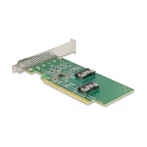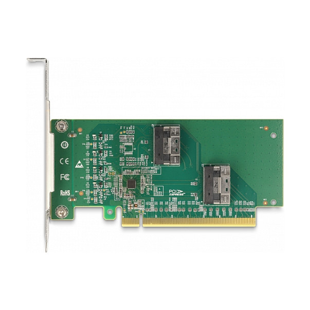 "DeLOCK PCI Express 4.0 x16 Card to 4 x SFF-8639 NVMe - Bifurcation - Low Profile Form Factor. Host interface: PCIe, Output interface: U.2. Data transfer rate (max): 64 Gbit/s. Windows operating systems supported: Windows 10, Windows 7, Windows 8.1, Server operating systems supported: Windows Server 2016. Package type: Box"\n"This PCI Express card by Delock expands the PC by four SFF-8639 interfaces. SSDs with e.g. U.2 interface can be connected to these ports.
