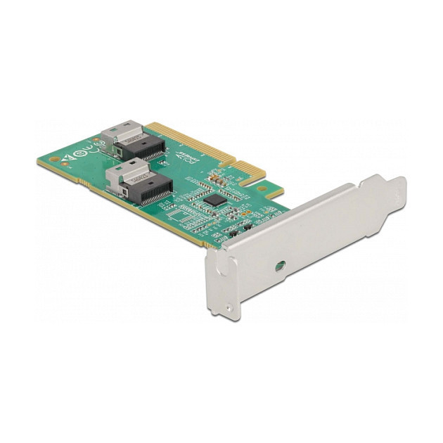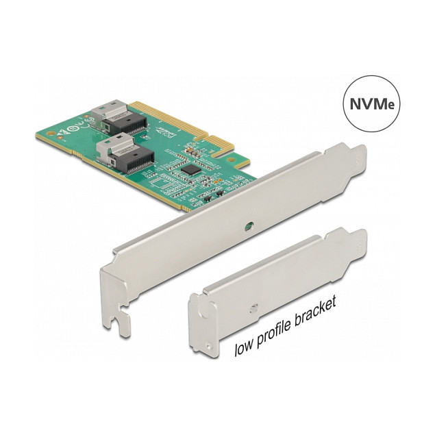 "DeLOCK PCI Express 4.0 x8 Card to 2 x internal SFF-8654 4i NVMe - Bifurcation - Low Profile Form Factor. Host interface: PCIe, Output interface: SFF-8654, Expansion card form factor: Low-profile. Product colour: Stainless steel, Country of origin: China. Connector 1 gender: Female, Connector 2 gender: Female, Data transfer rate (max): 64 Gbit/s. Windows operating systems supported: Windows 10, Windows 10 x64, Windows 8.1, Windows 8.1 x64, Linux operating systems supported: Linux Kernel 5.8, Server operating systems supported: Windows Server 2019. Quantity per pack: 1 pc(s), Package type: Box"\n"This PCI Express card by Delock expands the PC by two SFF-8654 interfaces. SSDs with e.g. U.2 interface can be connected to these ports by using an optional cable. The card transmits PCI Express signals using the NVMe protocol.